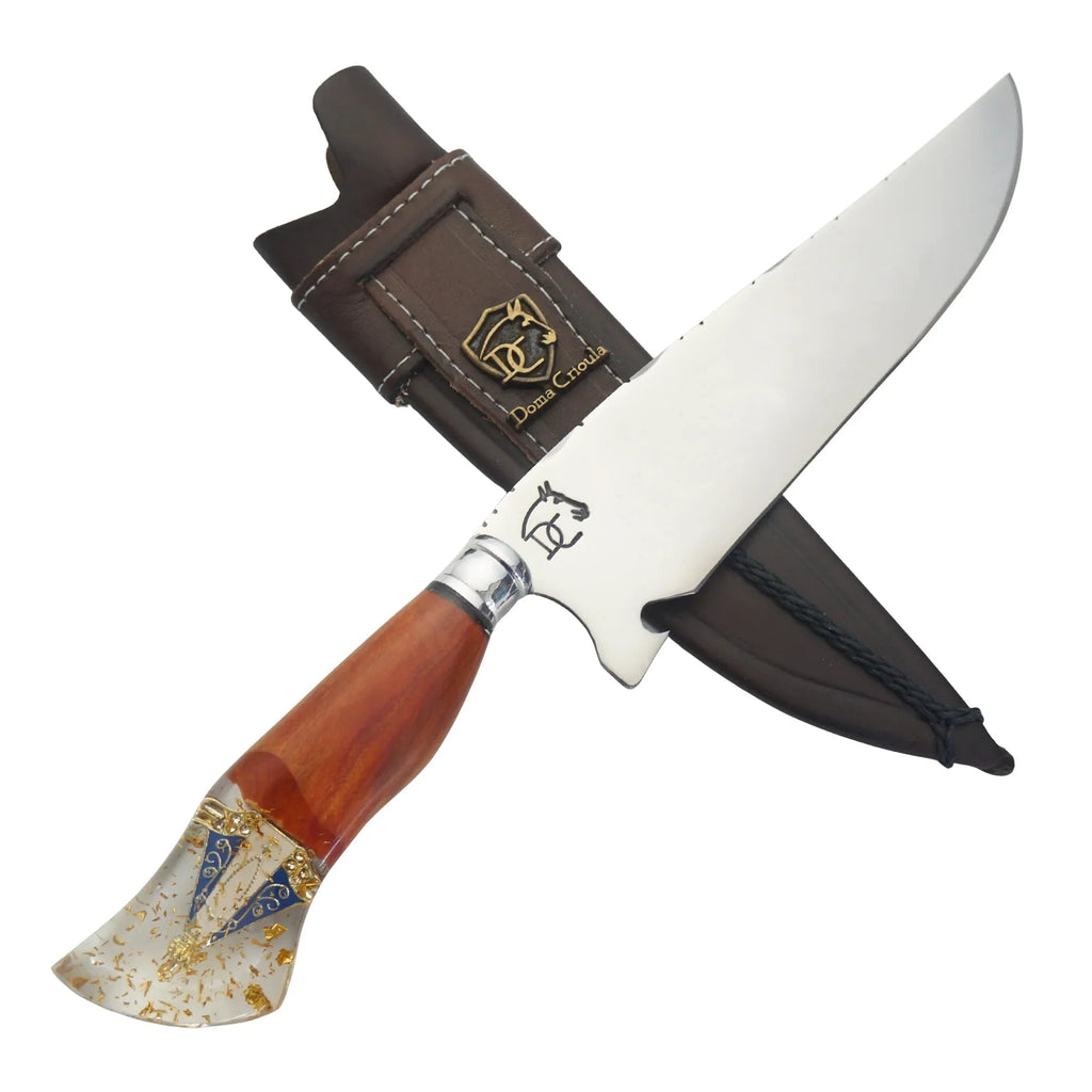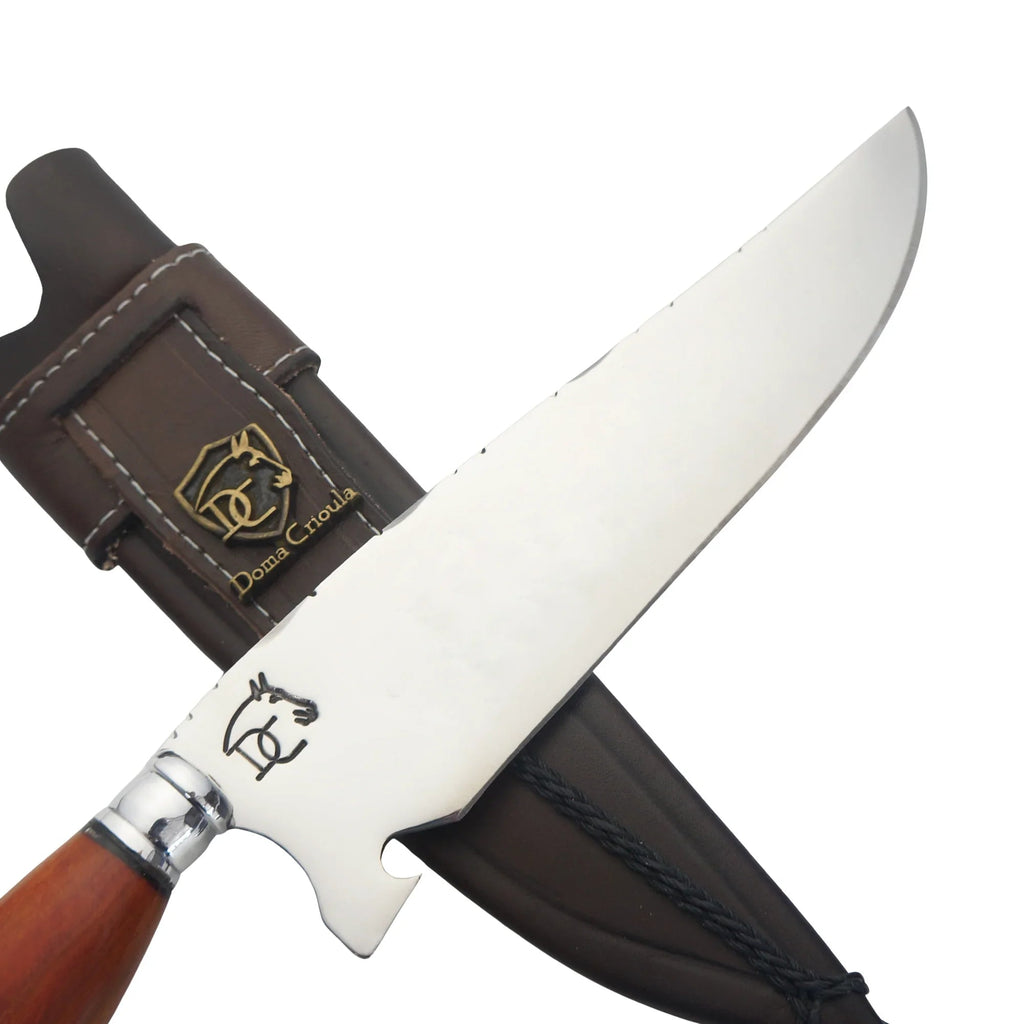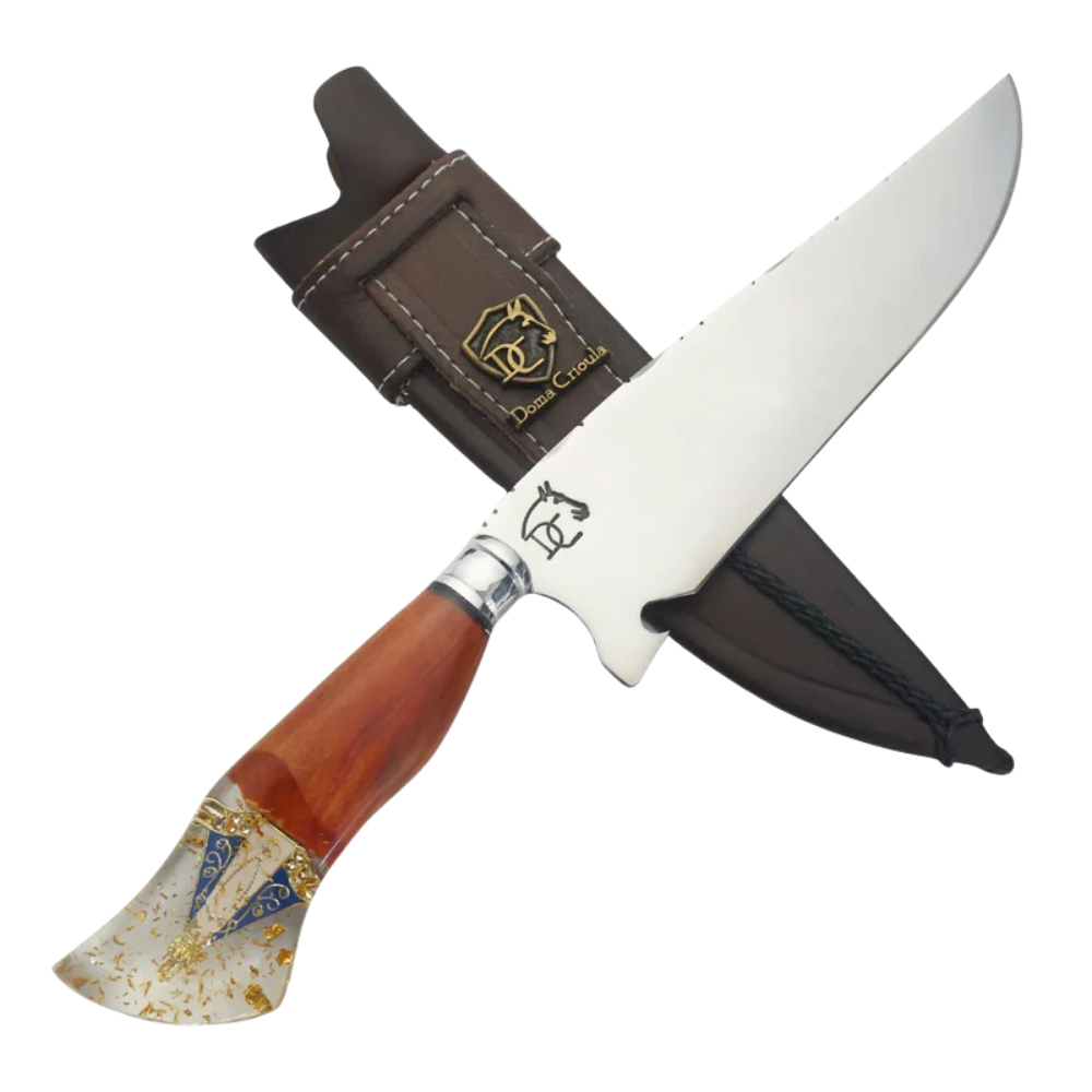 Esta faca é uma verdadeira peça de fé e arte. A imagem de Nossa Senhora com detalhes dourados encapsulada em resina torna cada churrasco um momento especial de celebração e gratidão. A lâmina lisa oferece cortes precisos e facilita a limpeza e manutenção.