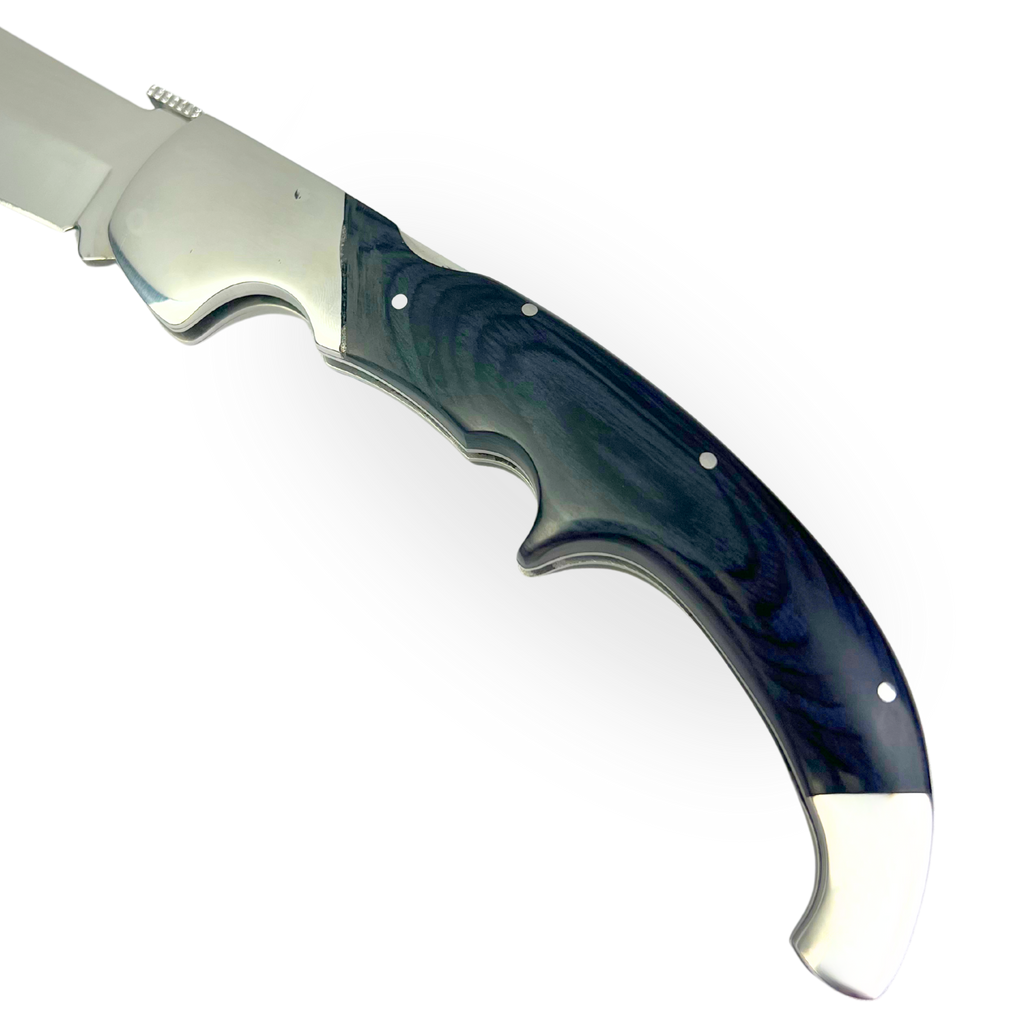 O cabo em resina com padrões perolados em azul e preto cria um visual moderno e sofisticado. Os detalhes em metal polido adicionam elegância e reforçam pontos críticos da estrutura. Cada elemento foi pensado para maximizar funcionalidade sem sacrificar a estética.