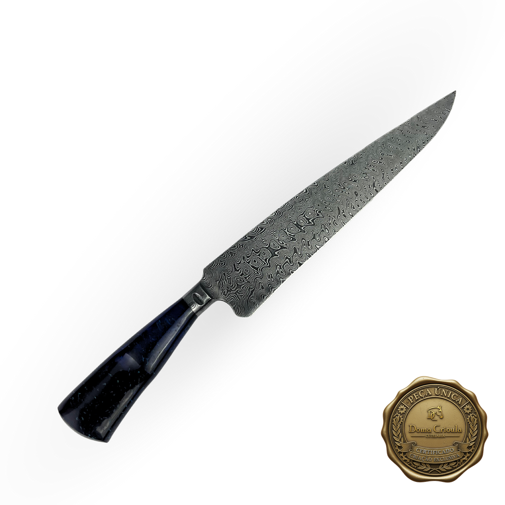 O cabo em resina azul de 12 cm proporciona excelente pegada e conforto, além de criar um contraste visual impressionante com o padrão do damasco. O dorso robusto de 5mm garante força e estabilidade excepcionais para qualquer tarefa.