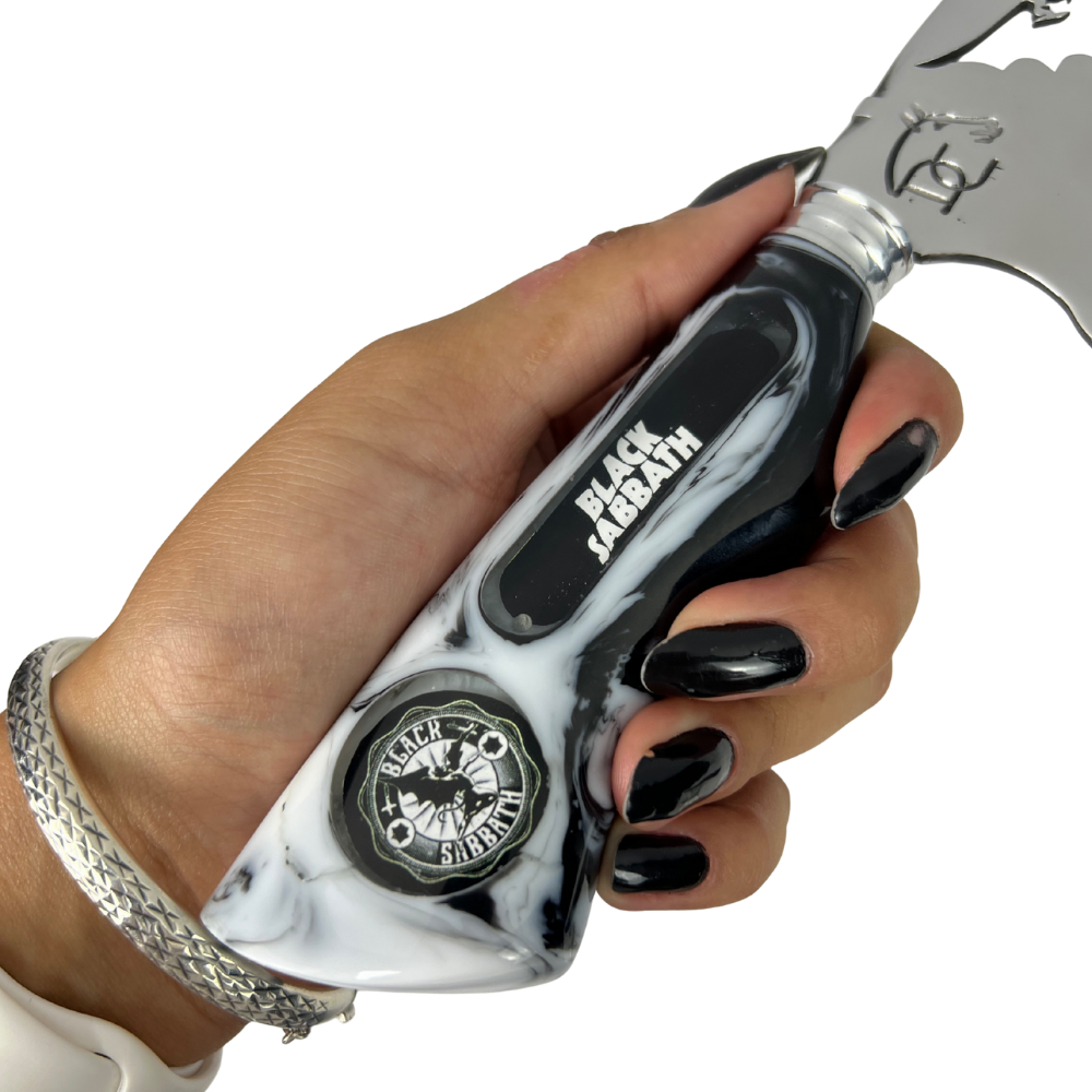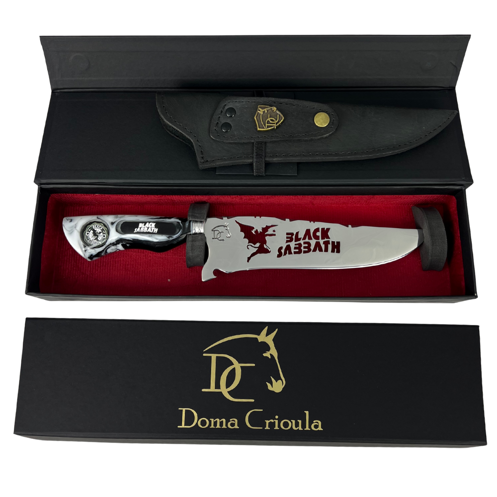 A Faca Black Sabbath é uma homenagem aos pioneiros do heavy metal que mudaram a história da música para sempre. Com design dark e acabamento premium em resina marmorizada cinza e preta, esta peça artesanal celebra o legado de Ozzy Osbourne, Tony Iommi e a essência sombria do doom metal.