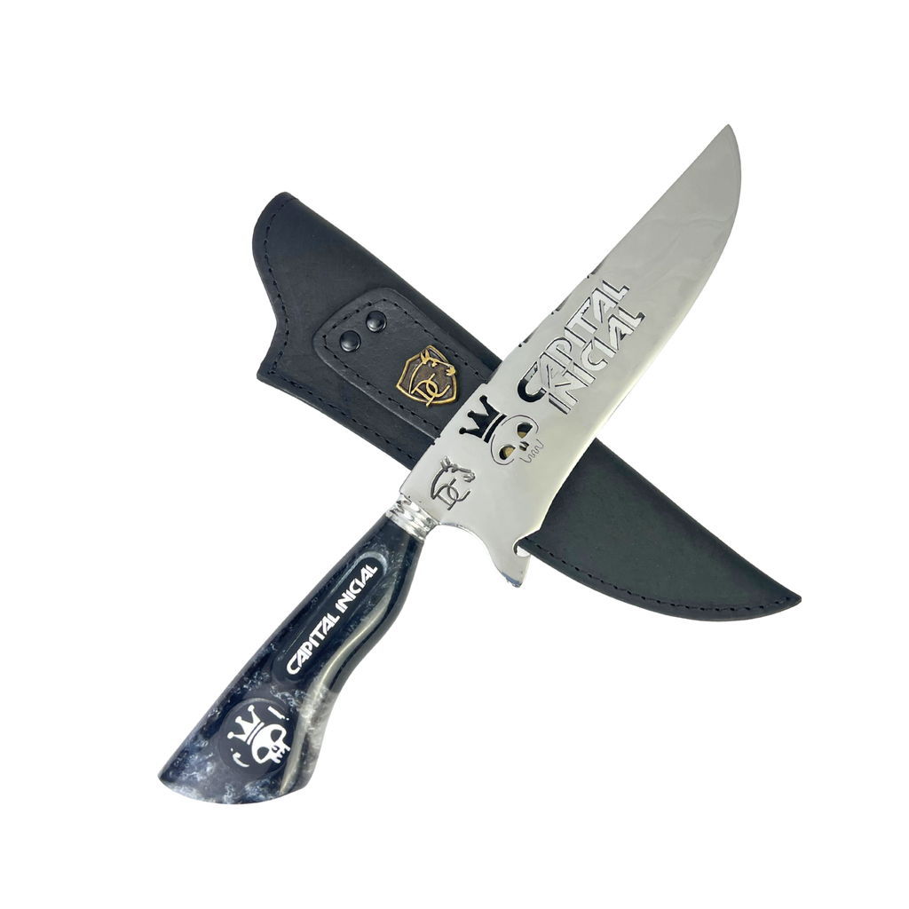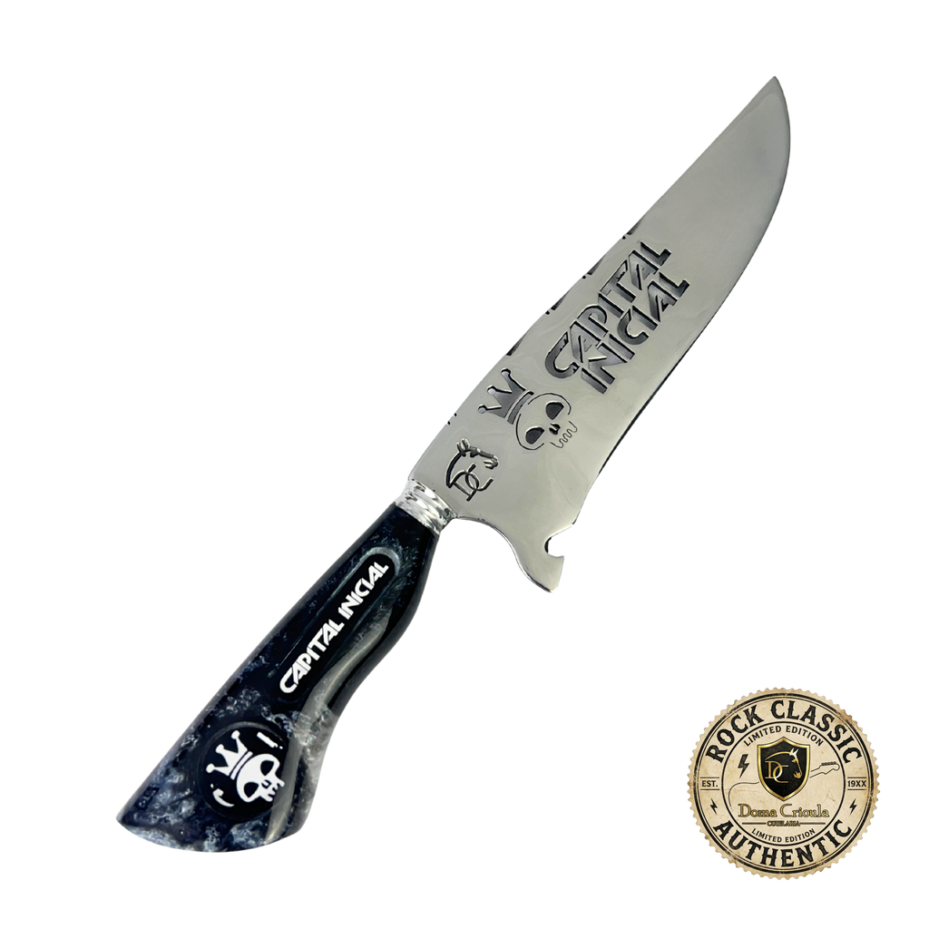 Sua lâmina de 8 polegadas com vazado temático exibe o nome Capital Inicial em alto relevo com a icônica caveira da banda, enquanto o cabo em resina marmorizada preta com veios cinza apresenta o texto "CAPITAL INICIAL" e o símbolo da caveira em destaque. O padrão marmorizado único cria um visual elegante e rebelde, perfeito para colecionadores de rock nacional.