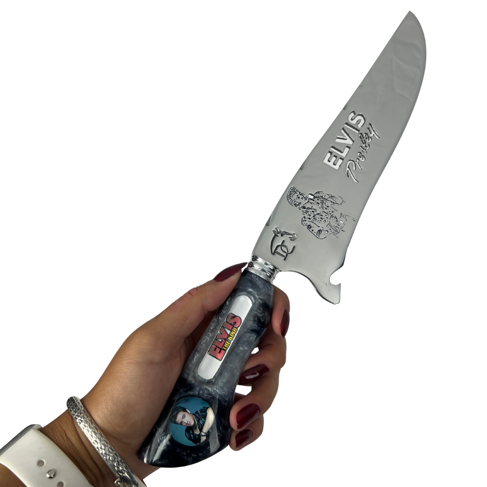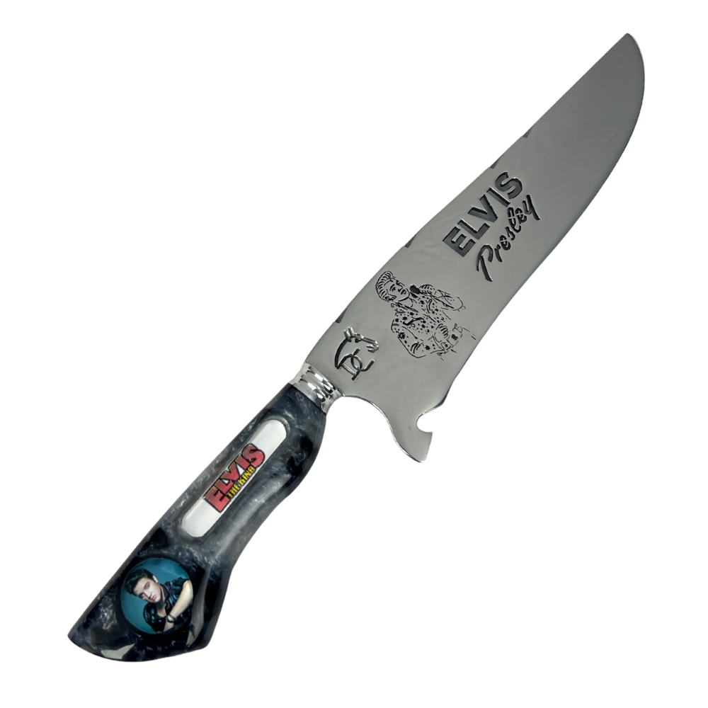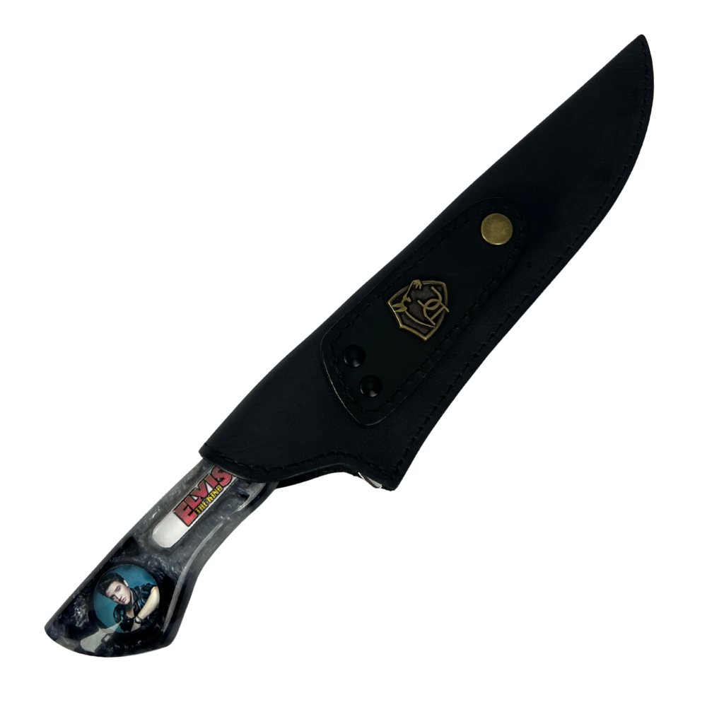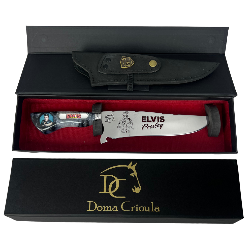 Para os verdadeiros fãs do Rei do Rock que apreciam cutelaria de alta qualidade! Esta faca exclusiva traz toda a energia e atitude da lenda Elvis Presley, combinando artesanato premium com o espírito do rock'n'roll clássico.