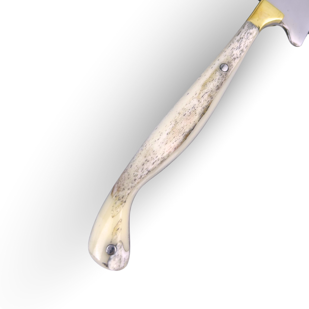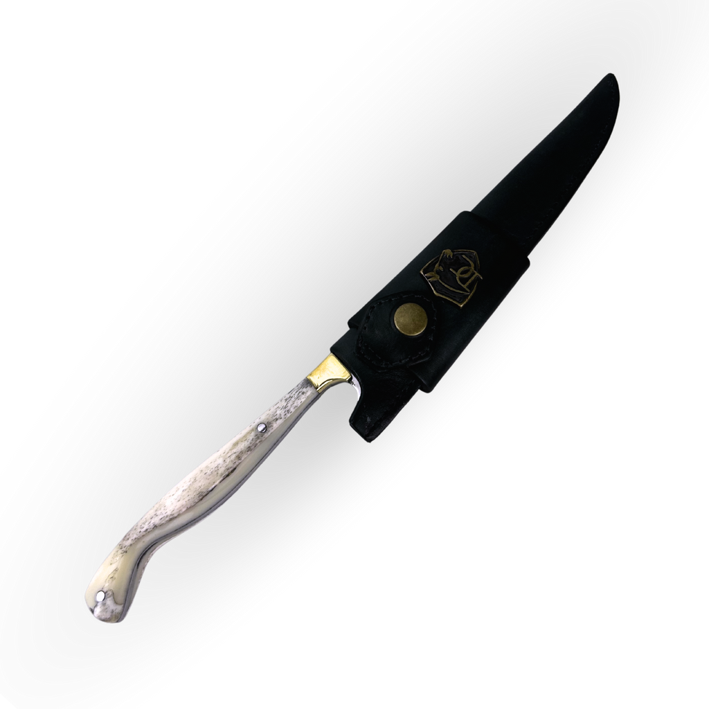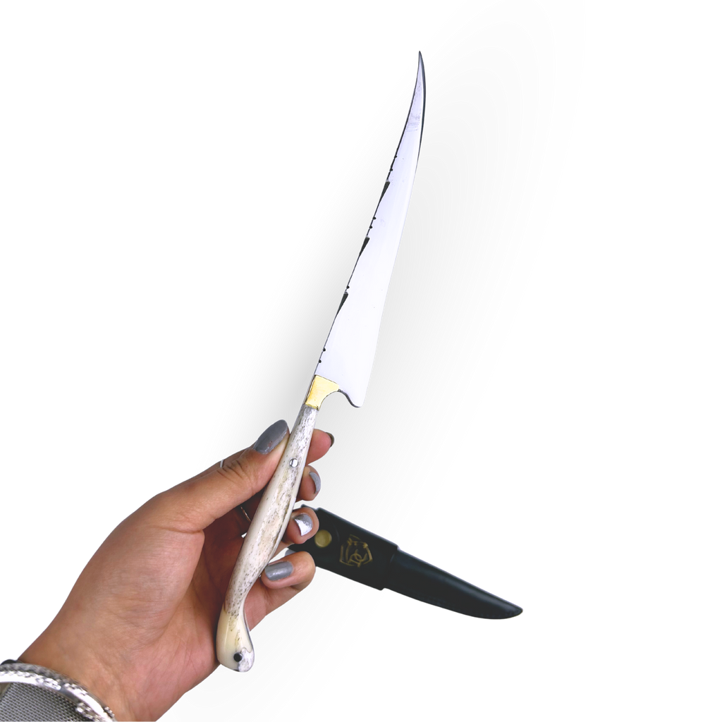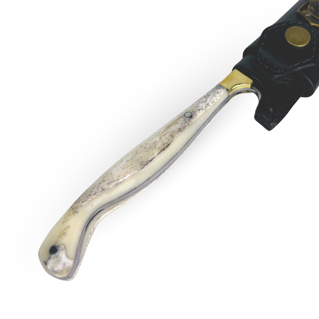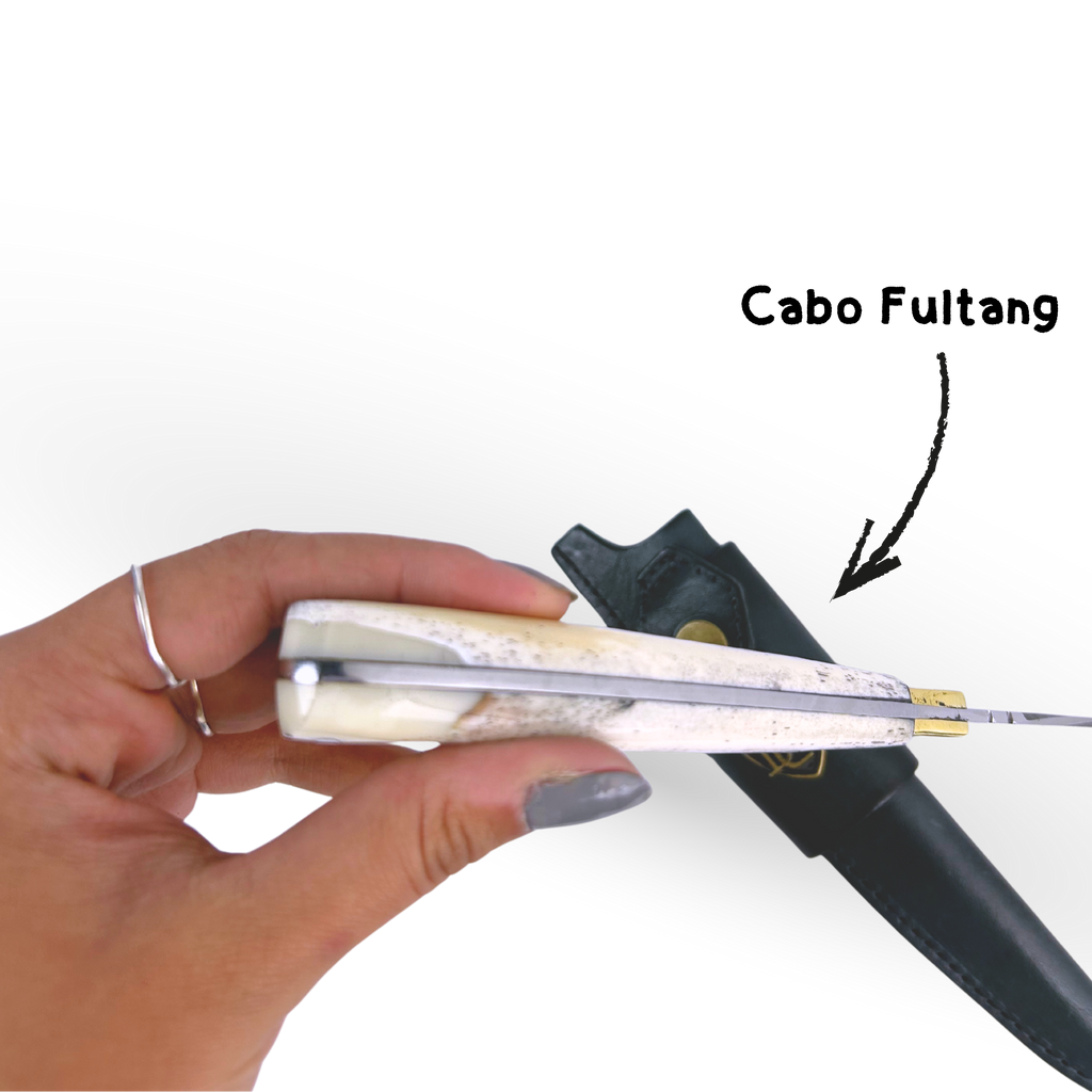 - Cabo: Construção Full Tang em autêntico osso bovino natural, proporcionando equilíbrio perfeito, pegada firme e beleza clássica