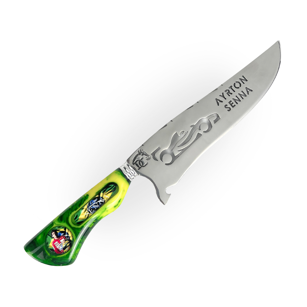 O cabo em resina com tons de verde e amarelo não é apenas uma homenagem visual - representa a paixão brasileira pelo automobilismo e pelo churrasco. Cada detalhe foi pensado para criar uma peça que Senna ficaria orgulhoso de ter em sua mesa.