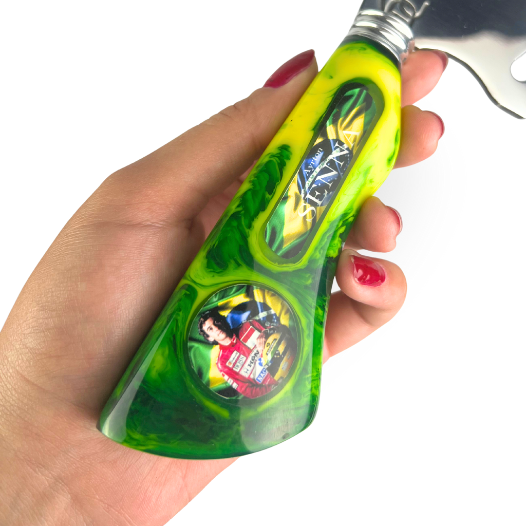 - Cabo em Resina: Design exclusivo em tons de verde e amarelo, cores da bandeira brasileira e do capacete icônico de Senna