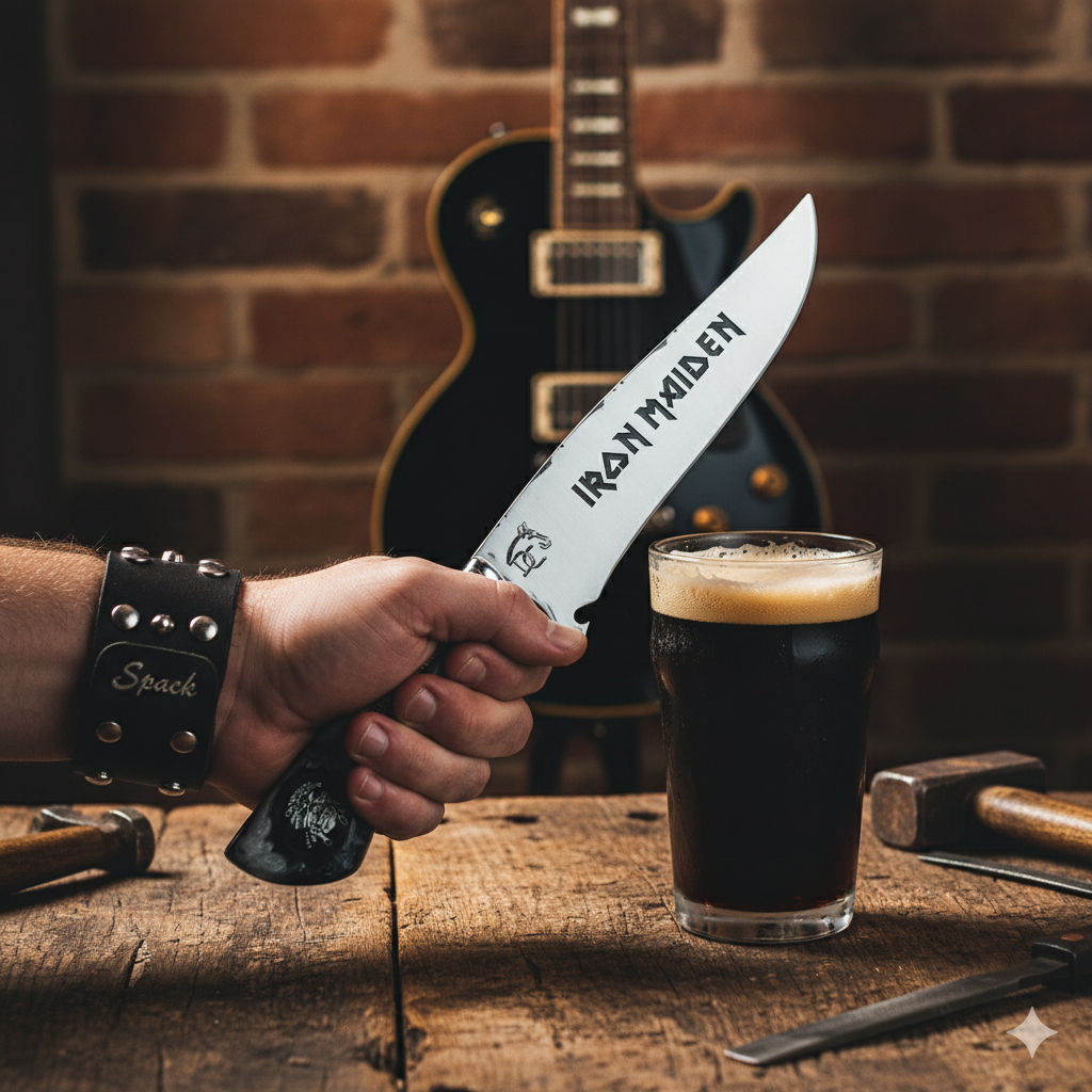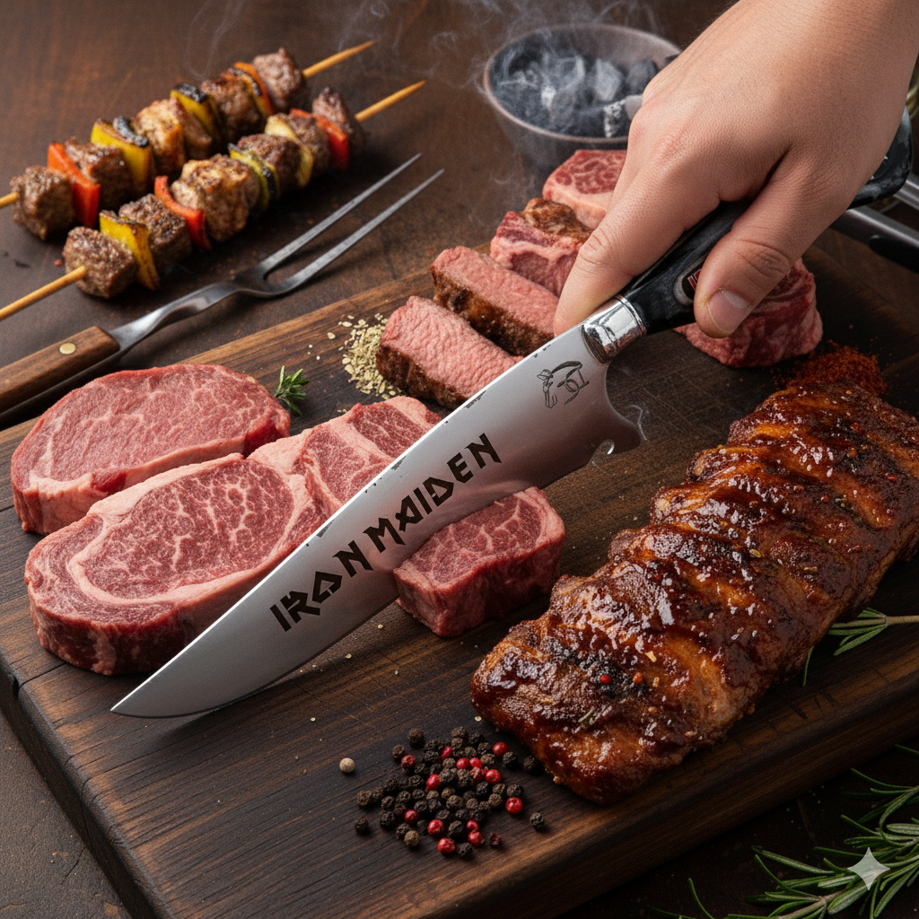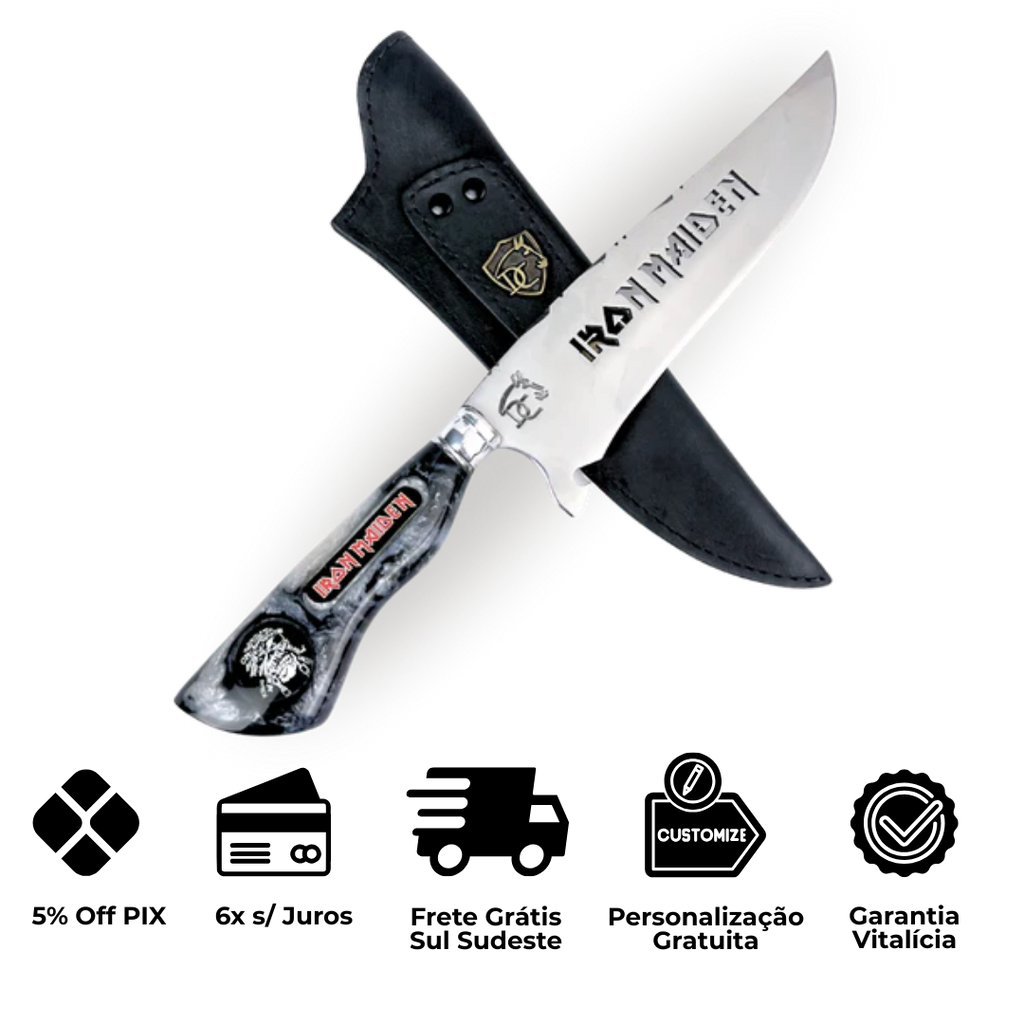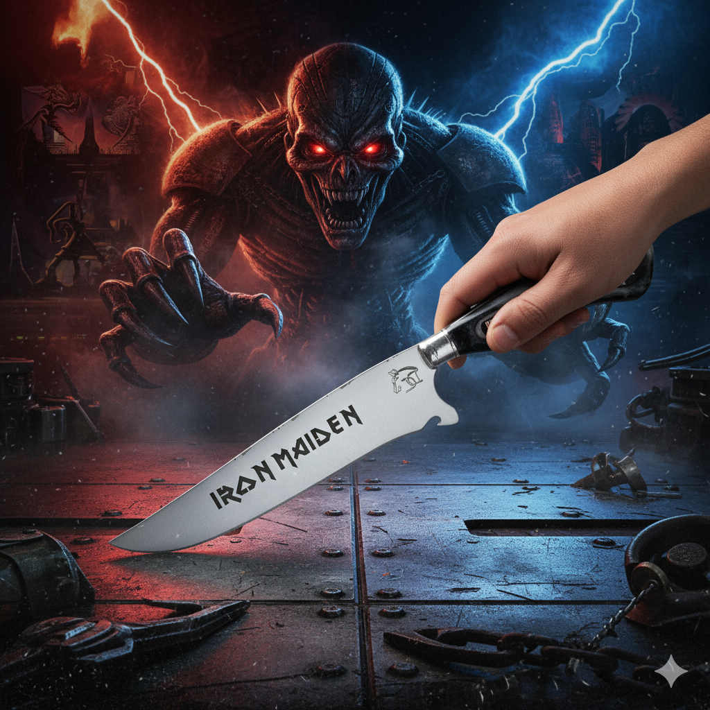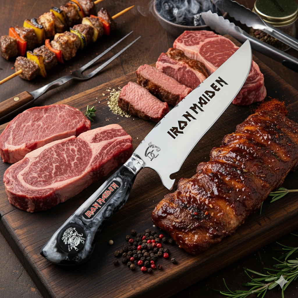 Para os verdadeiros fãs de heavy metal que também são mestres do churrasco, apresentamos a Faca Picanheira Iron Maiden - uma peça artesanal que une a brutalidade do rock com a precisão da cutelaria premium.