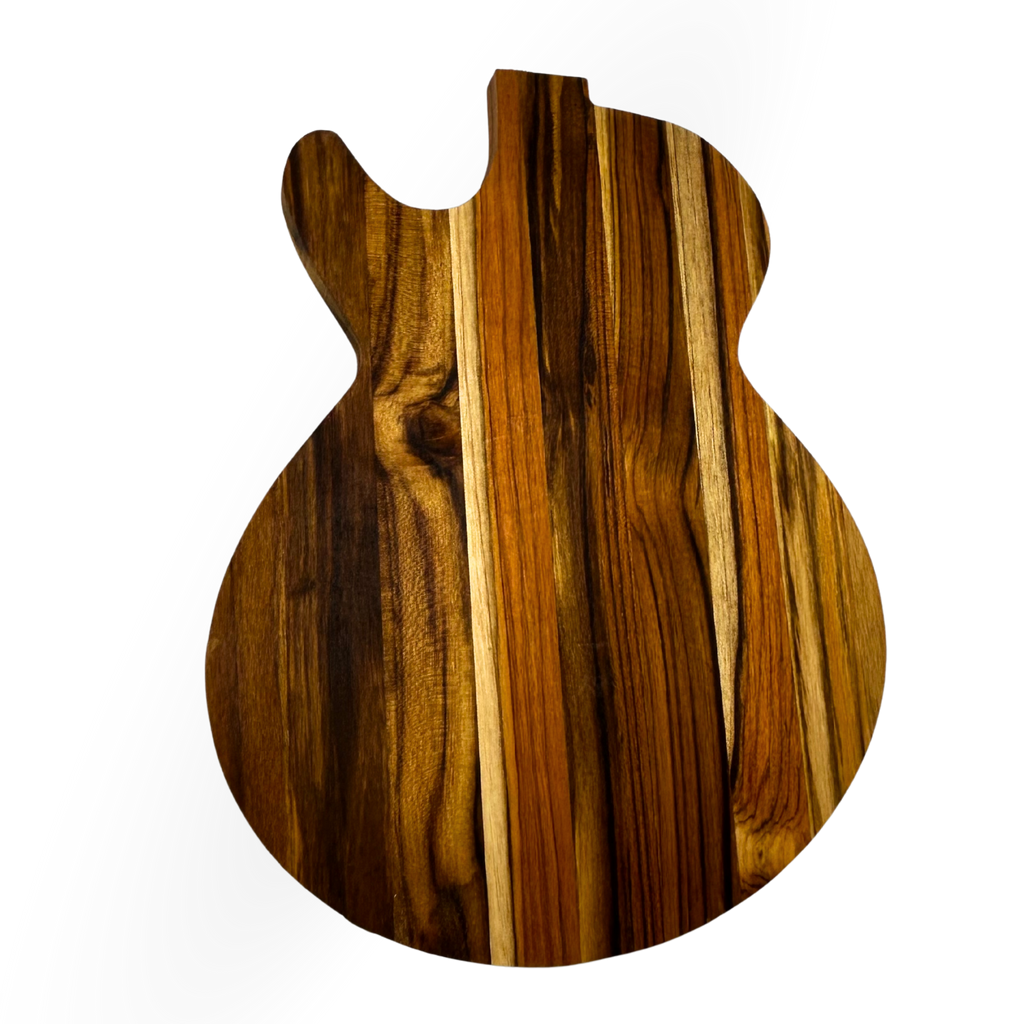 Formato guitarra, madeira nobre selecionada, gravação a laser de alta precisão, acabamento em resina epóxi, peça artesanal única.